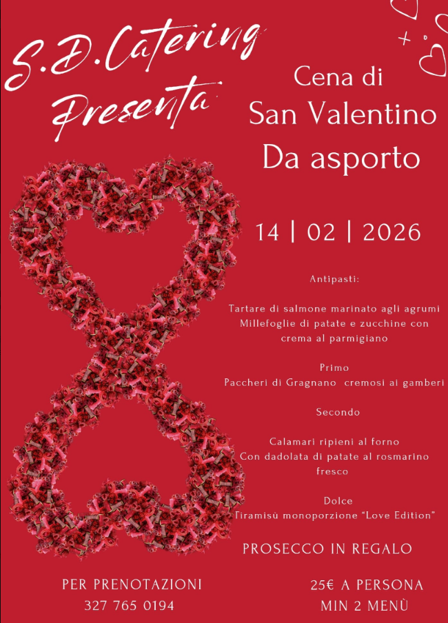 The Valentine’s Day takeaway dinner by S.D. Catering offers a complete, elegant, and well-balanced menu, prepared with selected ingredients and designed to be enjoyed on the most romantic day of the year.
