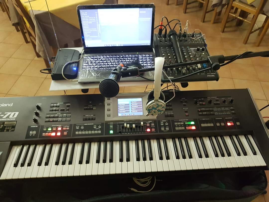 - Tastiera Arranger Ketron Event , Mixer Allen & Heath ZED‑14 ,due Pc portatili , Impianto Audio LD SYSTEM Maui 3 G, Luci led su asta per la pista da ballo, microfono Shure Beta A 58, e 2 Radio microfoni per Karaoke.