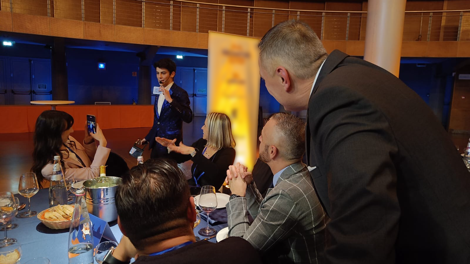Durante la serata si muove tra gli invitati con magia ravvicinata (close-up), creando piccoli gruppi, conversazioni spontanee e momenti di stupore condiviso. È quel tipo di esperienza che le persone commentano, fotografano e ricordano.