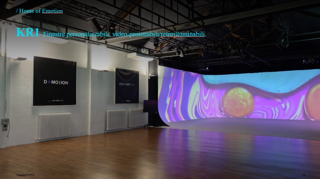 Uno spazio versatile, innovativo e immersivo dal design contemporaneo, concepito per adattarsi facilmente a qualsiasi format (eventi immersivi, shooting fotografici, presentazioni, produzioni video e spettacoli dal vivo) grazie alle sue attrezzature tecniche all'avanguardia, pre-integrate e pronte all'uso.