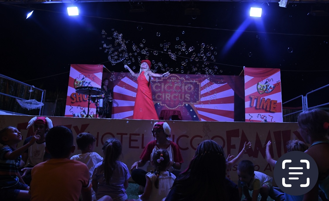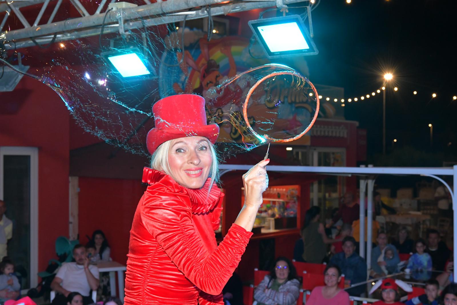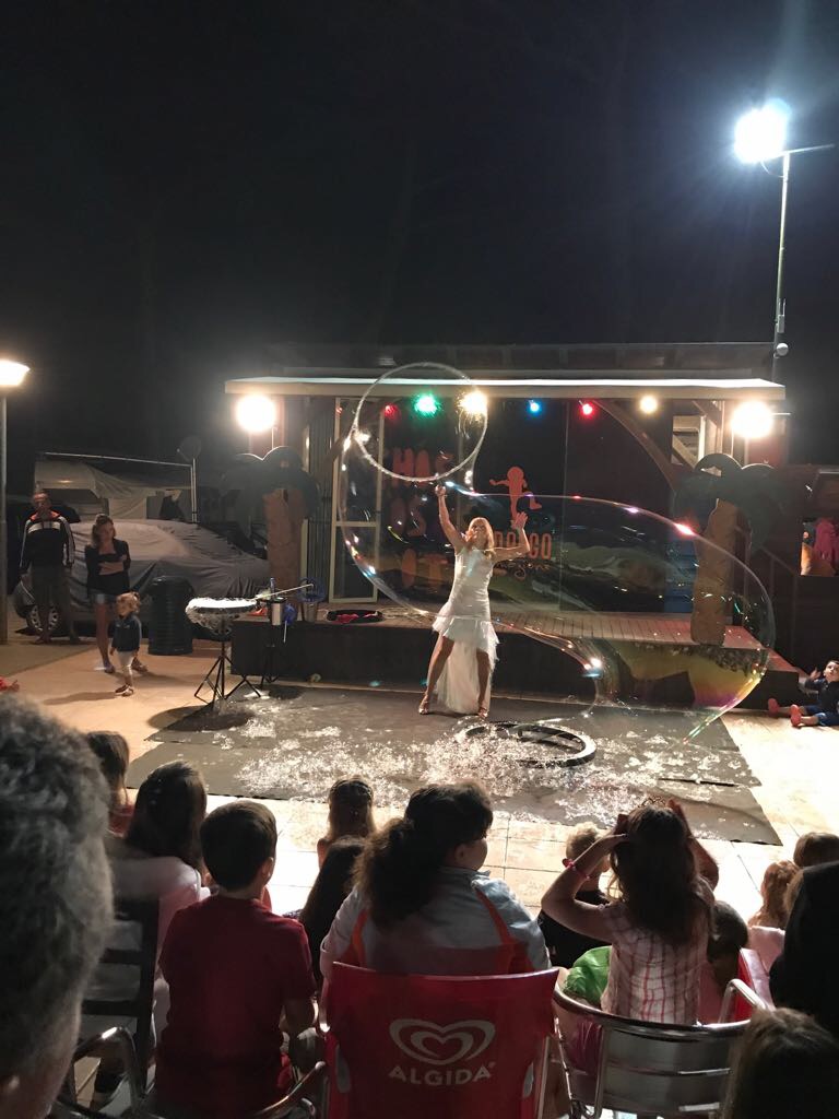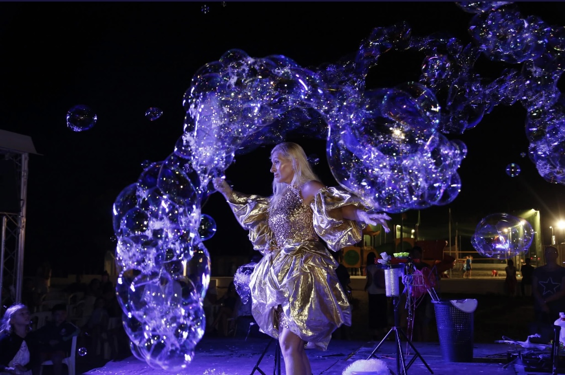 Al termine dello spettacolo, coinvolgo il pubblico con la creazione di una bolla gigante, all’interno della quale possono entrare sia i più piccoli che gli adulti, vivendo un’esperienza unica e suggestiva.