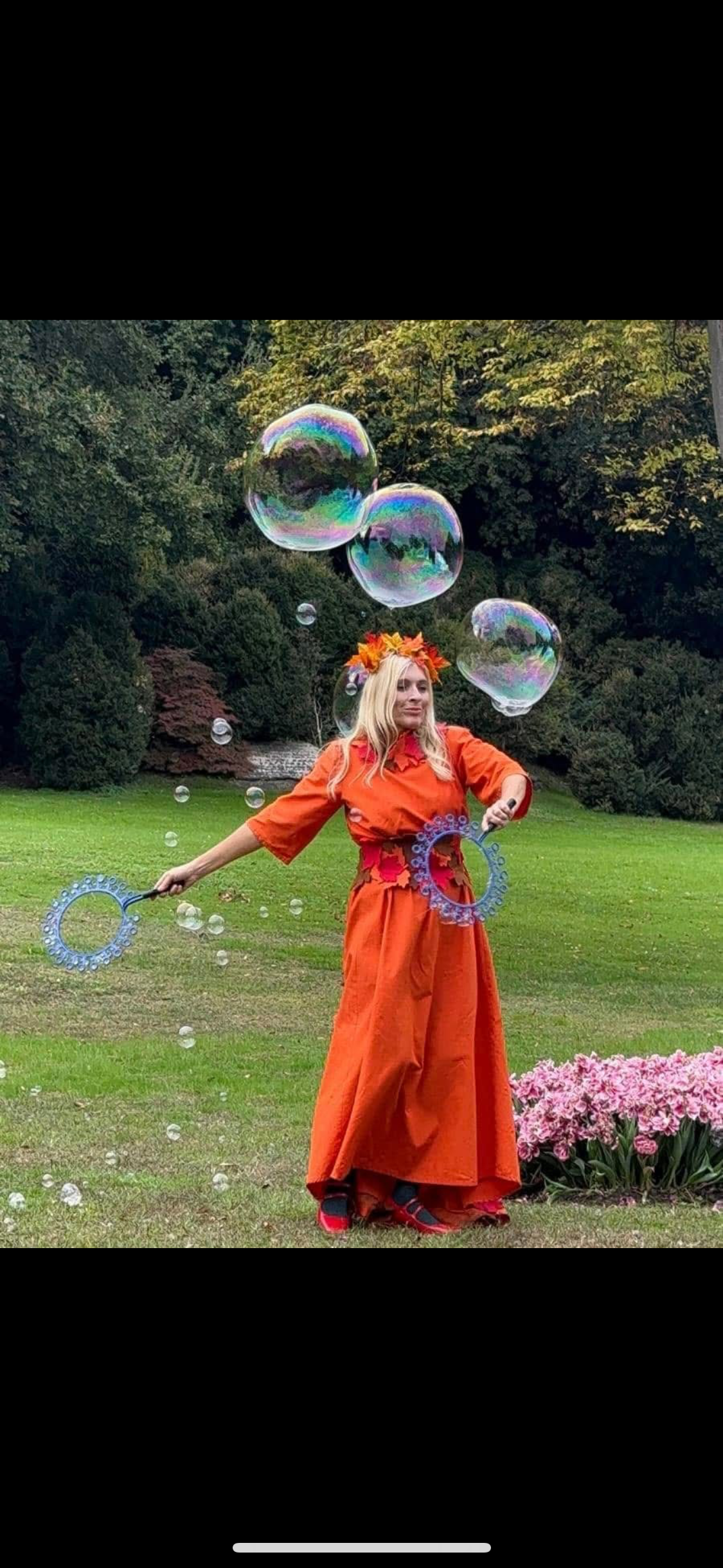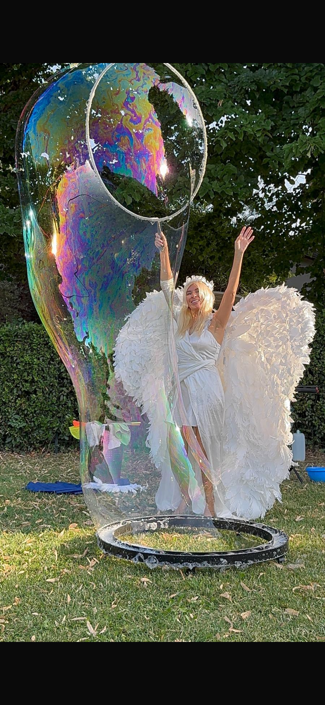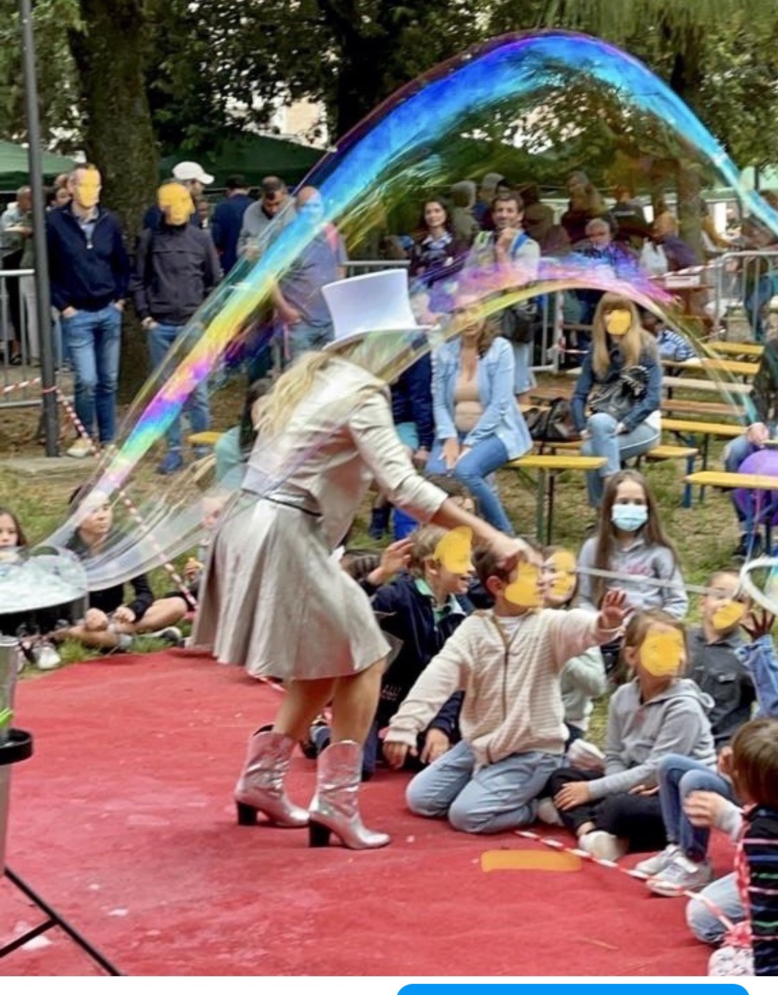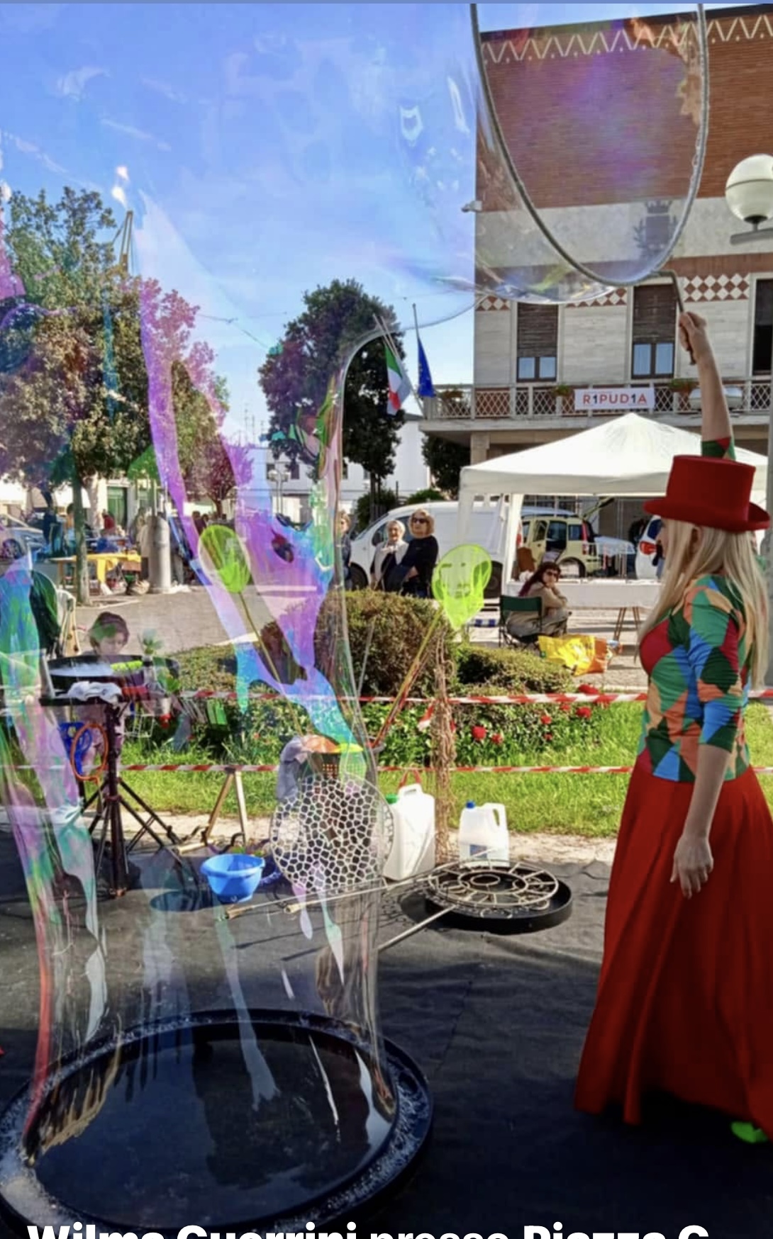 Al termine dello spettacolo, coinvolgo il pubblico con la creazione di una bolla gigante, all’interno della quale possono entrare sia i più piccoli che gli adulti, vivendo un’esperienza unica e suggestiva.