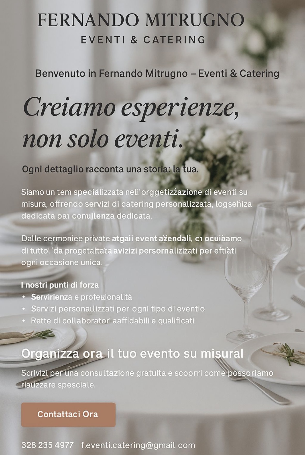 È il momento di volere di più; del resto, è il giorno del tuo matrimonio! Fernando Mitrugno è un consulente è specializzato nel settore eventi e catering. Si occupa della gestione commerciale, del coordinamento e dell’organizzazione operativa di eventi aziendali, privati e promozionali.